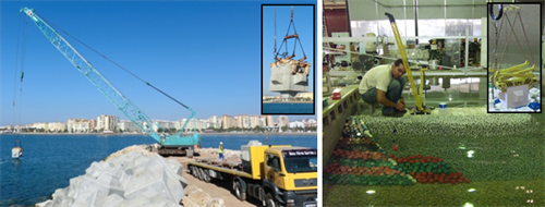 There have been realized studies and 3D realistic placement tests using small-scale crawler cranes, waves and pressure clamps to place units only with the X-Y coordinate information, like in real breakwater. In these tests, Cubipod placement grids were developed to be used in different slopes and breakwater sections in order to guarantee the uniform porosity of the protection layer.
